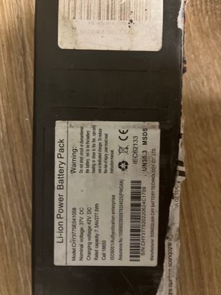 Batería de repuesto para patinete eléctrico. - Modelo: CHY3775E041058 - Voltaje nominal: 37V DC - Voltaje de carga: 42V DC - Capacidad: 7.5Ah/277.5Wh - Celdas: 18650 - Fabricante: DONGGUAN CHY BATTERY TECHNOLOGY CO LTD