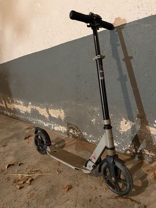 Patinete de la marca Decathlon. - Color plateado y negro. - Ruedas delanteras y traseras. - Manillar ajustable.