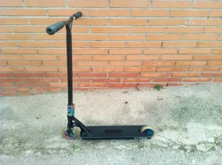 Patinete infantil diseñado para acrobacias. - Manillar negro con puños de goma. - Plataforma con diseño desgastado y freno azul. - Rueda delantera azul.