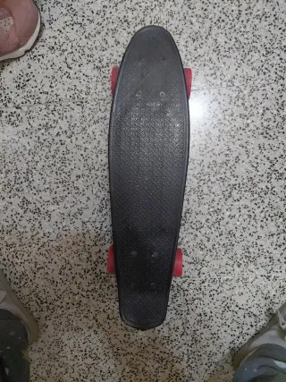Skate tipo Penny Board de color negro con ruedas rojas. Ideal para desplazamientos cortos y trucos básicos. - Tabla de plástico resistente. - Ruedas de poliuretano. - Ejes metálicos.