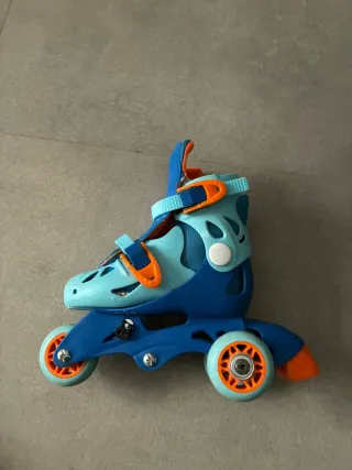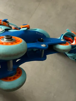 Patines en línea de color azul y naranja, ideales para iniciarse en el patinaje. - Talla ajustable de la 25 a la 28. - Diseño moderno y llamativo. - Cierre de velcro y hebilla para mayor seguridad. Son de Jugettos