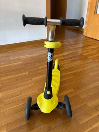 Patinete infantil de tres ruedas en color amarillo. - Tres ruedas para mayor estabilidad. - Manillar ajustable en altura. - Plataforma antideslizante. - Freno trasero.