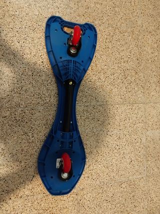 Patineta de dos ruedas con un diseño curvo y llamativo. - Color azul y gris. - Superficie con relieve para mayor agarre. - Asa lateral para facilitar el transporte.