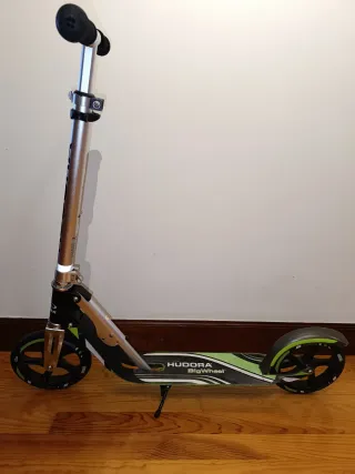 Patinete Hudora Bigwheel 205 en color negro y verde. Ideal para desplazamientos urbanos. Plegable. - Ruedas grandes de 205 mm. - Plataforma ancha. - Manillar ajustable en altura. - Freno trasero. - Pata de cabra.