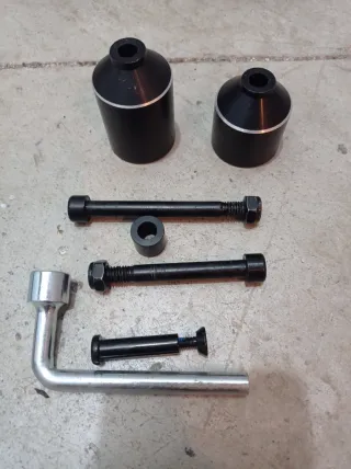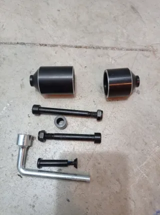 Nunca usados, son nuevos a estrenar. Set de dos pegs negros para patinete, con detalles plateados. - Fabricados en aluminio. - Incluye tornillos y llave para su instalación.