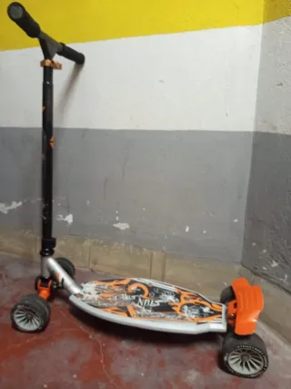 Patinete de tres ruedas con diseño deportivo y llamativo. - Ruedas delanteras dobles para mayor estabilidad. - Plataforma con diseño naranja y negro. - Manillar ajustable en altura.