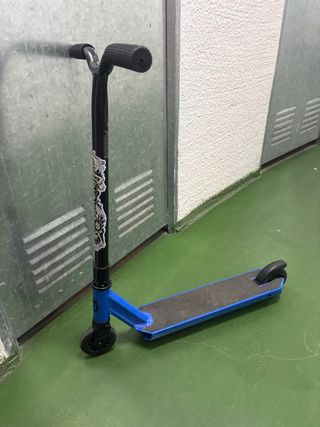 Patinete de estilo libre con manillar y puños de color azul. Diversas marcas que no me sé el nombre - Plataforma de patinete. - Ruedas. - Manillar.