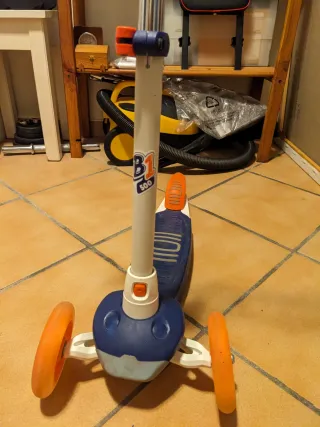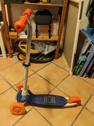 Patinete infantil de tres ruedas con luces de decathlon. Se recoge con facilidad y queda muy comprimido. - Ruedas de color naranja que se iluminan al rodar. - Base azul con detalles blancos. - Manillar con puños naranjas.