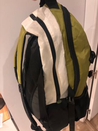 Mochila de la marca Powerslide, diseñada para llevar patines y equipo. - Color verde y blanco. - Cremalleras negras. - Logo de la marca 'ps' en el tirador de una cremallera.