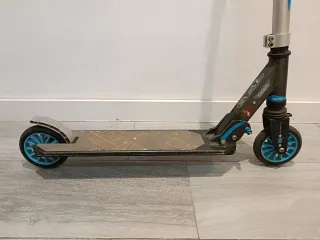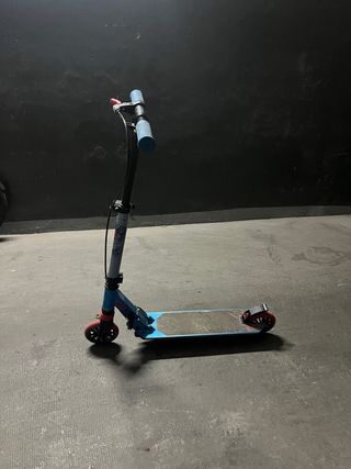 Patinete infantil de dos ruedas, ideal para niñ@s de 9 a 14 años aunque mi hijo con siete ya lo llevaba. Es plegable para facilitar su transporte y almacenamiento. - Ruedas de color azul. - Plataforma antideslizante. - Manillar ajustable en altura.