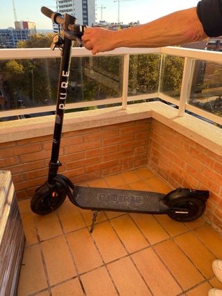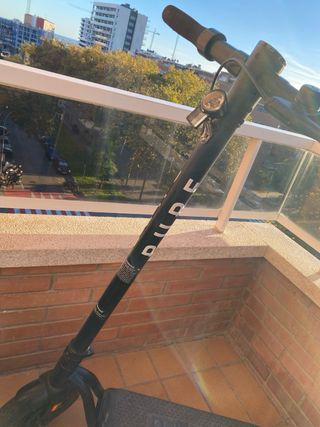 Patinete PURE AIR en color negro. El patinete es funcional y se enciende sin problema, pero le falta la abrazadera, que es la pieza que fija y sujeta el manillar a la base del tubo. También sería recomendable cambiar la batería, ya que aún lleva la original de serie. Necesita además una limpieza general por el uso. Perfecto para alguien que quiera dejarlo a punto con un par de arreglos básicos.