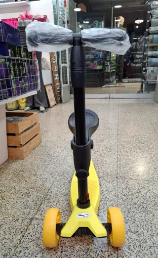 Retiro Tienda Paloma, calle Francesc Llunell 51, Esplugues de Llobregat. Patinete de tres ruedas en color amarillo, ideal para los más pequeños. Cuenta con un asiento ajustable para mayor comodidad. - Tres ruedas para mayor estabilidad. - Asiento extraíble y ajustable. - Manillar con empuñaduras de goma.
