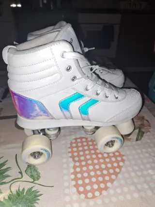 Estos patines de cuatro ruedas son de color blanco y tienen un diseño alto. - Cierre con cordones. - Detalles de rayas en los laterales. - Ruedas de color crema. Estan nuevos. Talla 37