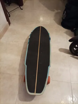 Skate surf de la marca Escama con un diseño llamativo. - Ruedas de color naranja. - Diseño con motivos florales en tonos azules y verdes.