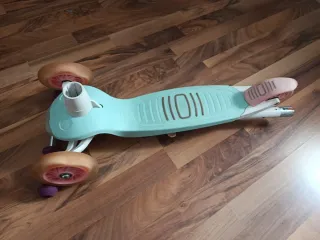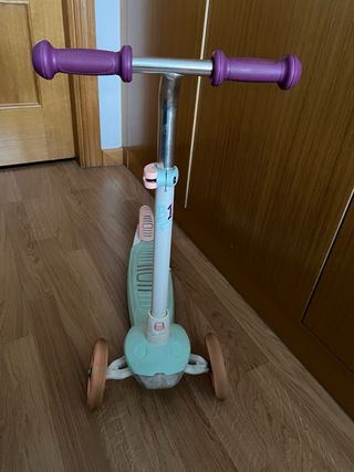 Patinete de tres ruedas en color menta y rosa, ideal para niñas. Cuenta con luces en las ruedas que se activan con el movimiento. - Tres ruedas para mayor estabilidad. - Puños de goma para un agarre cómodo. - Plataforma antideslizante. - Manillar ajustable en altura.
