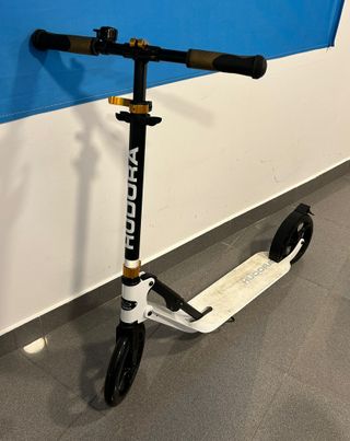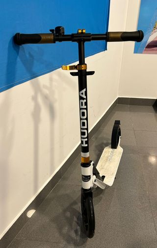 Patinete de la marca Hudora en color blanco y negro. Ideal para desplazamientos urbanos. - Manillar ajustable. - Ruedas negras. - Plataforma blanca con logo. 🛒Compra con envío o recoge en nuestra tienda de Fuenlabrada: 📍 Calle de Leganés 44 B. ♻️ Producto REACONDICIONADO con ligeros daños estéticos que no afectan su funcionamiento.
