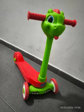 Este patinete tiene un divertido diseño de dragón. - Color principal verde. - Detalles en color rojo. - Ruedas rojas.