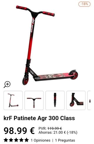 Scooter KRF AGR 300 Class en muy buen estado, color rojo y negro, prácticamente sin uso. Diseñado para freestyle y acrobacias urbanas, cuenta con rama de aluminio reforzada de 57 × 43 cm, plataforma antideslizante de 49,6 × 11,4 cm con griptape de colores y manillar cómodo con agarre de goma. Equipado con ruedas PU 100 × 24 mm, dureza 88A, rodamientos ABEC‑7 y gato trasero de frenado. Sistema de triple clamp para máxima estabilidad y seguridad. Soporta hasta 100 kg, ideal para principiantes y riders experimentados que buscan durabilidad, control y estilo en sus trucos urbanos.