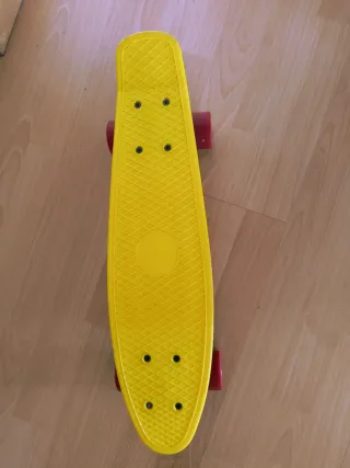 Monopatín de plástico amarillo, ideal para iniciarse en el skate. - Diseño clásico. - Ruedas rojas.