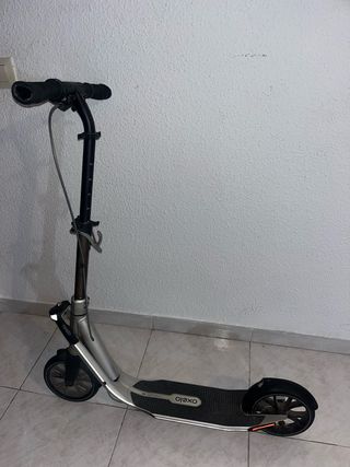 Patinete OXELO en buen estado. Ideal para desplazamientos cortos. - Diseño plegable para facilitar su transporte y almacenamiento. - Color plateado con detalles en negro. - Ruedas resistentes.