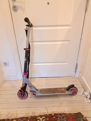 Patinete infantil de color rosa, versátil y divertido. En buen estado. - Diseño de tres ruedas para mayor estabilidad. - Manillar ajustable en altura. - Empuñaduras ergonómicas para un agarre cómodo. El patín de ha usado más en la última fase ,es decir como tal . Sin el asiento. Incluye todas las piezas y accesorios. No tiene luces en las ruedas.