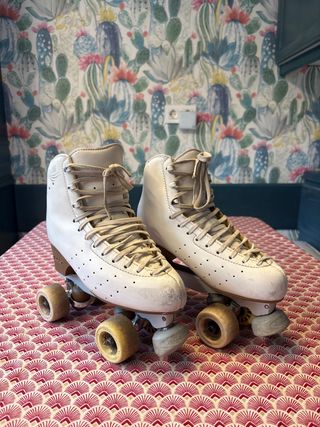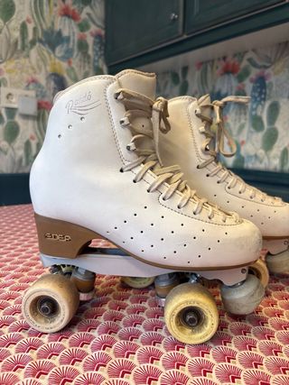 Patines artísticos Rondo Edea, talla 260T. Diseñados para patinaje artístico. Se han cambiado los rodamientos hace muy poco. Se entregan con rodamientos de repuesto. - Bota alta de cuero blanco. - Cordones de ajuste. - Ruedas para patinaje artístico.