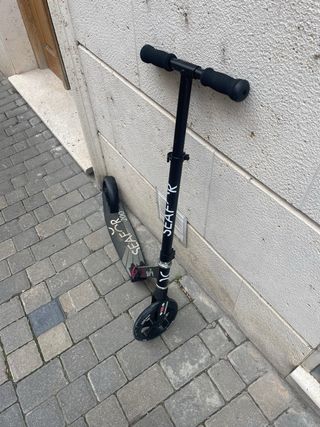 Patinete eléctrico Skote Flosh en color negro. - Diseño moderno y funcional. - Manillar ajustable en altura. - Ruedas delanteras y traseras. - Plataforma antideslizante. - El acelerador no funciona de hay el precio. -Tiene su cargador original.