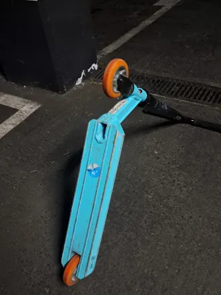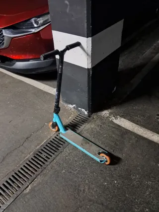 Patinete de trucos en color azul, perfecto para iniciarse en el mundo del skatepark. - Plataforma resistente. - Ruedas de color naranja. - Manillar negro.