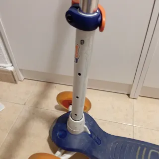 Patinete infantil con mangos naranjas y detalles azules. - Manillar ajustable en altura. - Ruedas de goma con luz. - Diseño resistente.