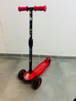 Patinete de color rojo para niños. - Ruedas delanteras y traseras. - Manillar ajustable. - Plataforma para los pies. - Lleva freno.