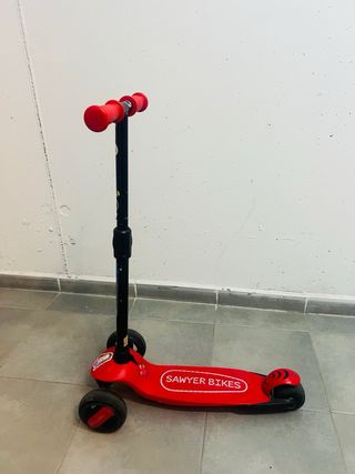 Patinete infantil de tres ruedas en color rojo. Ideal para los más pequeños. - Diseño de tres ruedas LED que se iluminan al coger velocidad - Manillar ajustable en altura. - Ruedas de goma. - Decorado con pegatinas, que se pueden quitar - Marca: Sawyer Bikes