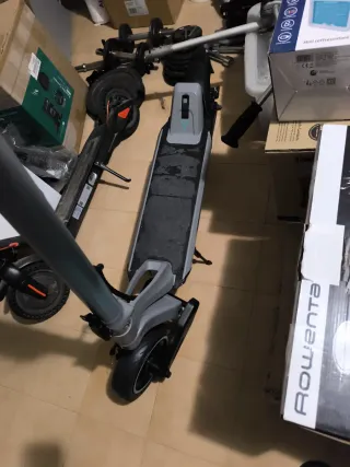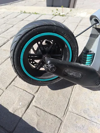 Patinete eléctrico en buen estado. La rueda de atrás es nueva y rígida, la de atrás está sin inflar. Incluye varios accesorios: - casco con pantalla y luz trasera - mochila trasera con intermitentes - mochila delantera - cargador