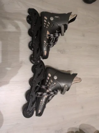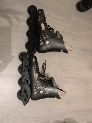 Se venden patines en línea de color negro. Son cómodos y están diseñados para patinar. - Ruedas de poliuretano. - Cierre de cordones y hebilla. - Botas acolchadas.