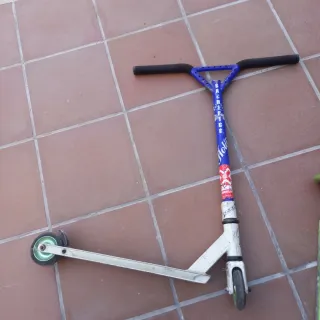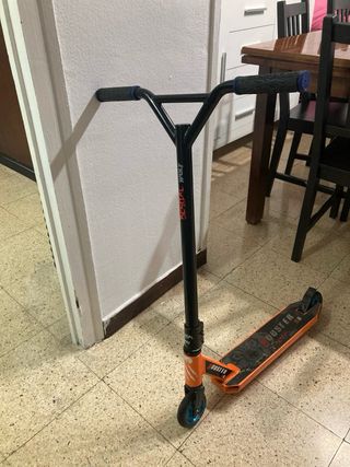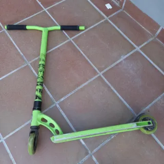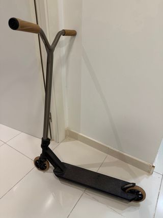 Patinete de estilo libre con manillar en forma de Y y puños texturizados. - Plataforma negra. - Ruedas de color marrón claro. - Usado solo una vez