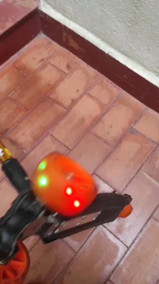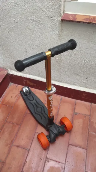 Patinete de tres ruedas s3Style, recomendado para mayores de 7 años hasta 11-12 años, peso máximo 50kg. Su diseño es llamativo, ergonómico y funcional para todo tipo de terrenos. - Manillar de acero ajustable en 3 alturas. - Ruedas anchas y resistentes color naranja con luces LED de diferentes colores(las delanteras) cuando está en movimiento y sobretodo cuando no hay sol son bastante llamativas. - Plataforma resistente negra, con freno trasero. - Peso del patinete 3'5kg aproximadamente. Tiene poco uso y bien conservado, excepto tiene algun tornillo con un poco de óxido (no afecta a su uso) ver penúltima foto.