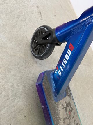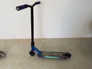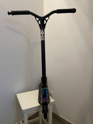 Patinete tipo freestyle (stunt), el de las fotos. Estructura sólida, sin sistema plegable, pensado para aguantar uso real. - Altura del manillar: 80 cm desde esuelo. - Manillar en T blanco, fijo, con puños negros en buen estado. - Base ancha con gráficos desgastados por el uso normal. - Horquilla y dirección robustas, sin holguras. - Ruedas pequeñas y duras, buen estado - Freno trasero metálico funcional. Usado, con golpes y rayaduras estéticas típicas de skatepark, nada estructural. para usar. Ideal para niños o adolescentes que quieren empezar con un patinete serio, no uno plegable ni de paseo.