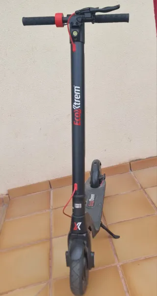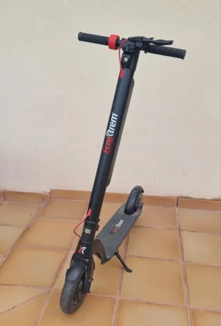 Patinete eléctrico de la marca Ecoxtrem en color negro. - Diseño moderno y funcional. - Manillar ajustable en altura. - Ruedas neumáticas para mayor comodidad. - Freno de disco trasero. Comprado julio 2023 (Con factura) Poco uso