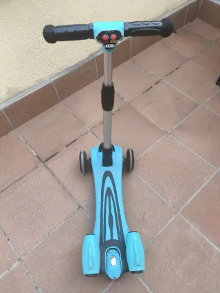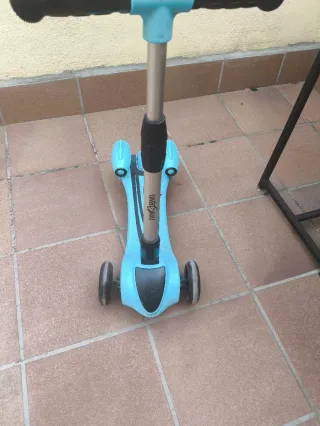 Patinete de tres ruedas s3Style, recomendado para mayores de 7 años hasta 11-12 años, peso máximo 50kg. Su diseño es llamativo, ergonómico y funcional para todo tipo de terrenos. - Manillar de acero ajustable en 3 alturas. - Ruedas anchas y resistentes color naranja con luces LED de diferentes colores cuando está en movimiento y sobretodo cuando no hay sol son bastante llamativas. - Plataforma resistente negra, con freno trasero. - Peso del patinete 3'5kg aproximadamente. Tiene poco uso y bien conservado, excepto tiene algun tornillo con un poco de óxido (no afecta a su uso) ver penúltima foto. #patinete #lucesleds
