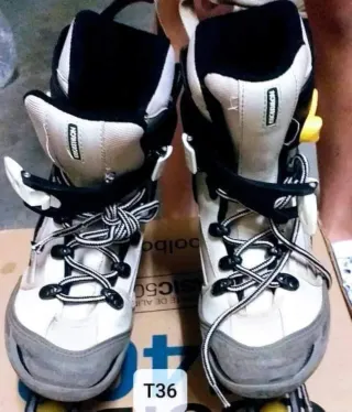 Patines en línea Oxelo en buen estado, talla 36. - Cierre con cordones y hebilla. - Diseño deportivo en blanco y gris. - Marca Oxelo visible.