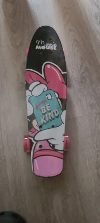Patinete con diseño de Minnie Mouse y el mensaje Be Kind. - Diseño de Minnie Mouse. - Mensaje Be Kind en la tabla. - Ruedas rosas.