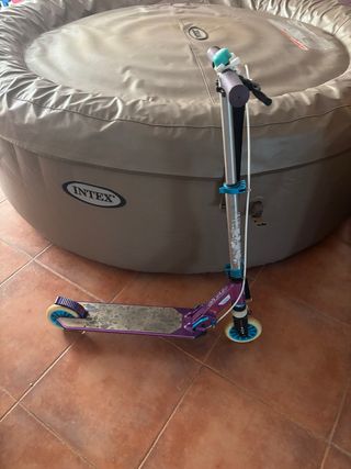 Patinete de estilo urbano con un diseño llamativo. - Color morado. - Ruedas de gran tamaño para mayor estabilidad. - Plataforma con diseño gráfico. - Manillar ajustable.