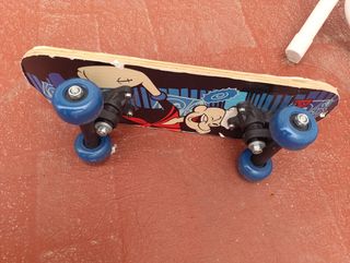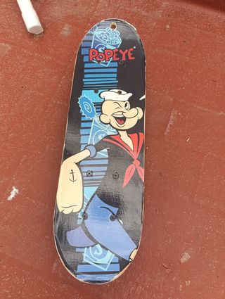Monopatín infantil con diseño de Popeye. - Ilustración de Popeye el marino. - Logo de Popeye en la parte superior.
