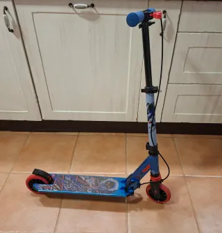 Patinete de dos ruedas en color azul, diseñado para niños a partir de 7 años. - Plataforma con diseño gráfico. - Ruedas de color rojo. - Manillar ajustable.