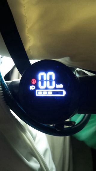 Patinete eléctrico en buen estado, con garantía. - Color negro y detalles verdes. - Ruedas con banda reflectante amarilla. - Pata de apoyo lateral.