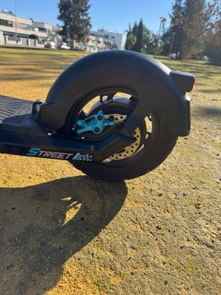 Patinete eléctrico con freno de disco en la rueda trasera. - Rueda trasera con disco de freno. - Guardabarros trasero. - Reflector naranja. - ruedas masisas