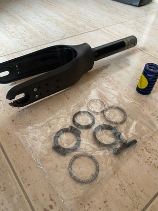 Horquilla delantera nueva para patinete Xiaomi Pro 2. Incluye rodamientos y muelle. - Horquilla negra. - Rodamientos para dirección.