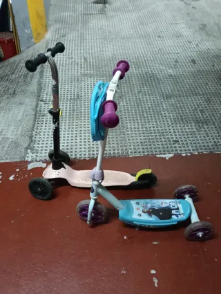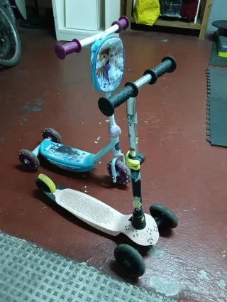 Se venden dos patinetes infantiles, uno rosa y otro azul con diseño de Frozen. - Patinete rosa con manillar negro. - Patinete azul con ruedas moradas y diseño de Frozen.