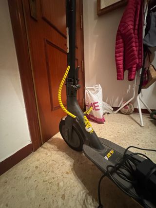 Patinete eléctrico de segunda mano. - Manillar con puños negros. - Pantalla digital con indicador de velocidad. - Freno manual en el manillar. - Cable de seguridad azul.