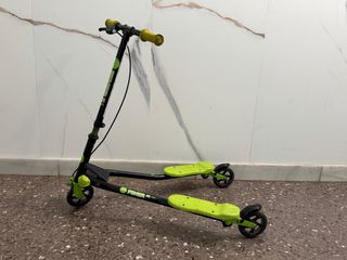 Patinete de tres ruedas con diseño deportivo en negro y verde. Manillar ajustable en altura. Plataformas antideslizantes. Ruedas de goma para un mejor agarre. Plegable. Puños en mal estado. Se pueden cambiar.