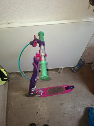 Patinete con diseño moderno y llamativo. - Ruedas de color verde brillante. - Manillar ajustable. - Freno trasero. - Pata de apoyo.